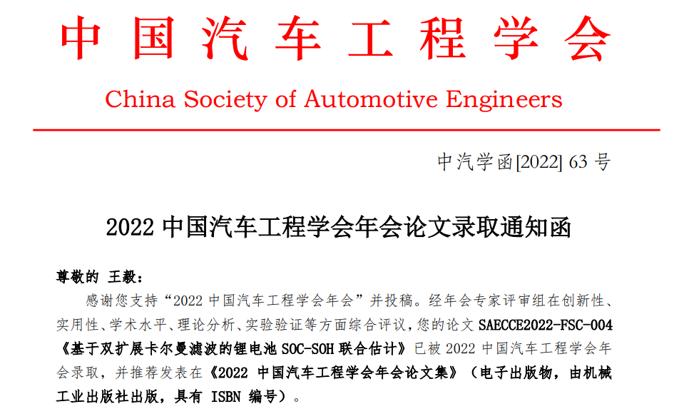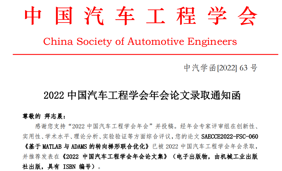 8月24日,中北大学行知车队拜志晨同学(能源与动力工程学院2020级车辆工程专业学生)以第一作者撰写的论文《基于 MATLAB 和 ADAMS 的转向梯形联合优化》及行知车队王毅同学(能源与动力工程学院2019级车辆工程专业学生)以第一作者撰写的论文《基于双扩展卡尔曼滤波的锂离子电池SOC-SOH联合估计》同时被2022中国汽车工程学会年会论文录用!