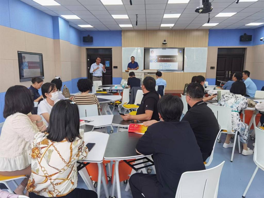 在交流研讨环节,与会人员讨论热烈,老师们就设备环境、版权、VR技术等数字教材建设相关问题进行了交流研讨。