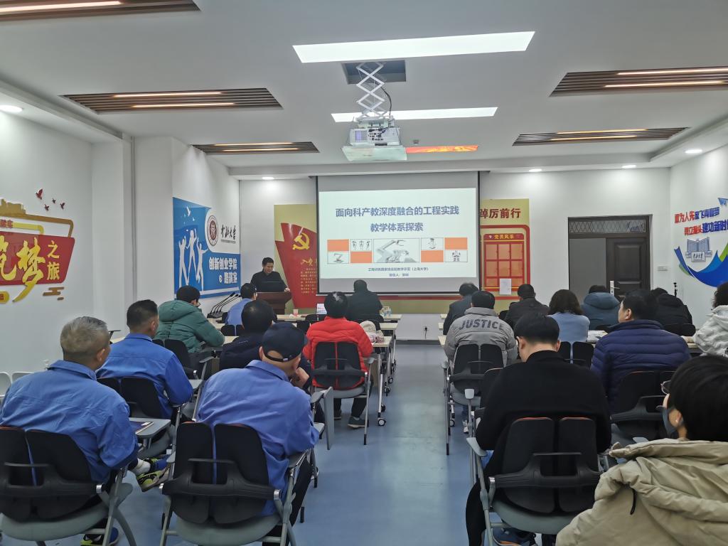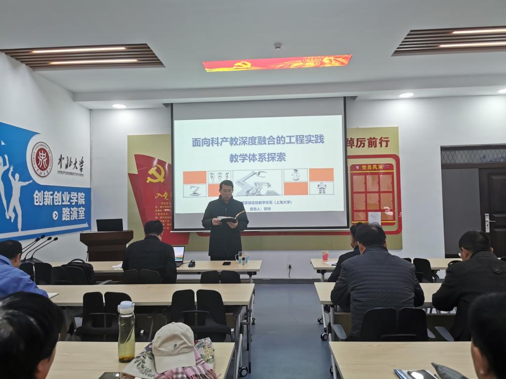 2023年11月27日,上海大学工程训练中心主任郭帅教授应邀为我院教职工作了题为《面向科产教深度融合的工程实践教学体系探索》的专题报告。报告由我校工程训练中心副主任冯再新教授主持,学院40余名教职工听取了报告并参与交流讨论。