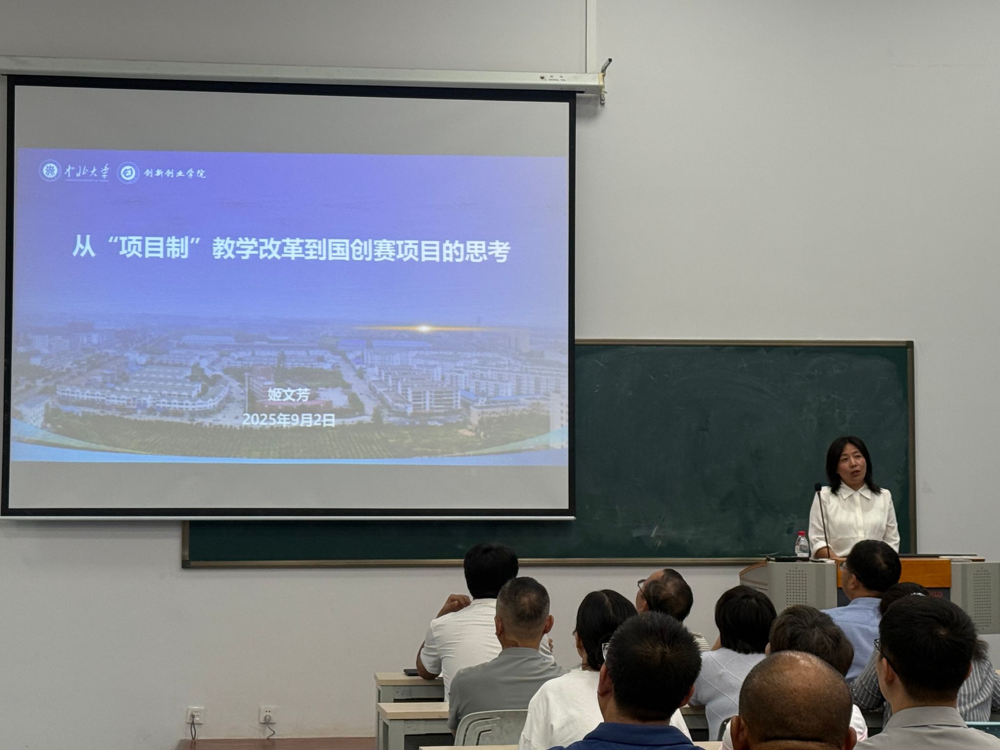 会议伊始,郎文杰副主任首先回顾了过去一年教学工作的亮眼成果,从课程建设、教学改革、质量监控等维度系统梳理工作亮点;随后围绕2025-2026学年教学工作重点,从教学计划优化、师资能力提升、实践教学强化等方面作出详细安排。紧接着,挂职副院长姬文芳以“从‘项目制’教学改革到国创赛项目的思考”为题作专题报告。报告紧扣创新创业教育核心,深入剖析“项目制”教学与国创赛项目的内在关联,提出以有组织的教学活动为抓手、以赛事成果为导向的育人思路,为全面提升创新创业工作提供了有力指引。