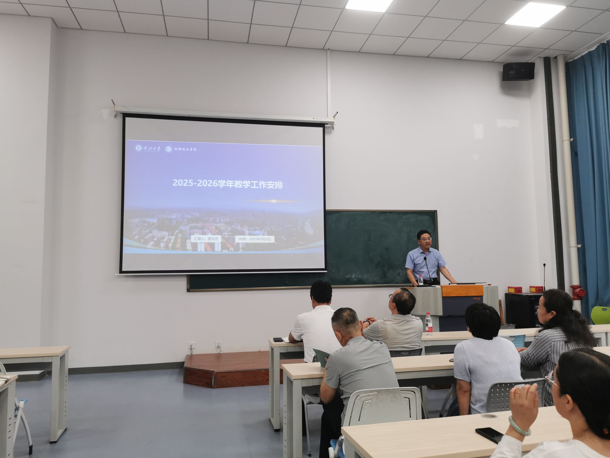 随后,曹凤才院长代表学院领导班子发言。他首先向暑期加班加点工作的教职工致以诚挚感谢,高度肯定大家在上一学年围绕人才培养、教学改革、创新创业实践等工作付出的艰辛努力与取得的显著成效。在全面总结上学年工作的基础上,曹院长结合高等教育发展趋势与学校战略部署,深刻分析了学院当前面临的新形势、新机遇与新挑战。锚定学校整体发展规划与学院“十五五”目标任务,曹院长从人才队伍建设、教学模式创新、科研平台搭建、赛事组织培育、校企合作深化等10个关键维度,对新学期重点工作进行全面部署,明确工作目标、压实工作责任,为学院高质量发展注入强劲动力。